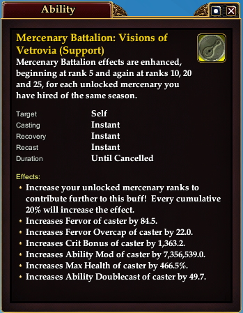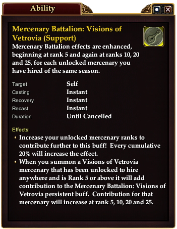Once you have unlocked your mercenary to hire anywhere and trained it above level 5, your mercenary will begin to provide bonuses to you even when it is not summoned. The more powerful the mercenaries that contribute to the Battalion effect are, the more powerful the effect is. To check the amount your current mercenary has contributed to the effect, simply right click them while they are summoned, and they will tell you how much they have personally contributed to the effect, as well as how much total contribution the effect has.