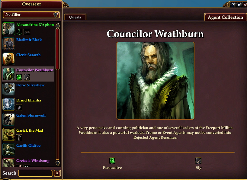 Each agent of Legendary tier or greater will have a number of specific traits that make them more suited to participating in specific quests, and less suited to others. You can search for an agent with a specific trait by typing the name of the trait in the search bar on the bottom of the agents list, or by clicking on the trait from an overseer quest.