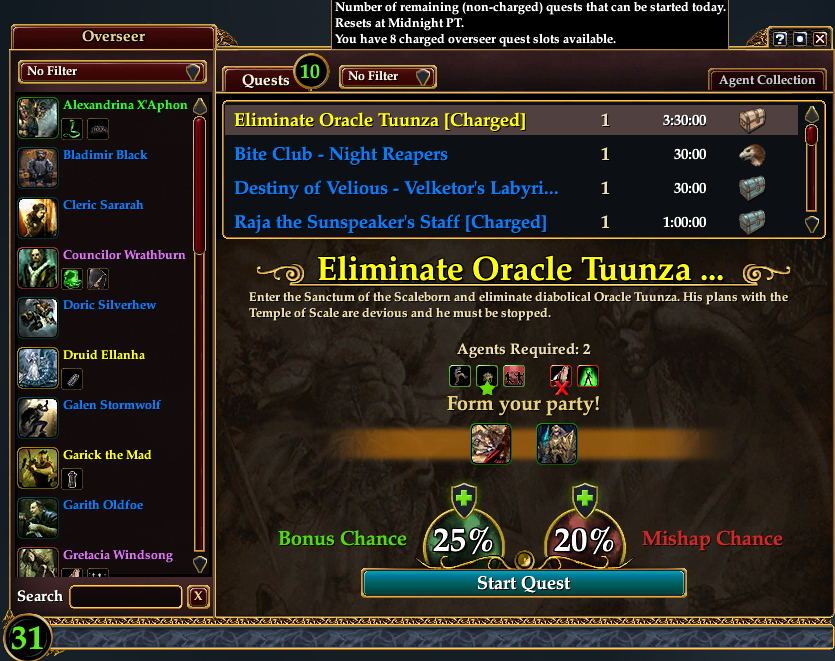 You will automatically have access to some quests, while others will be unlocked from various content, most notably from overseer quests rewards themselves. Members can run a total of 10 overseer non-charged quests per day on their account. Non-member Accounts that purchased the Blood of Luclin expansion are limited to 3 overseer quests per day. Higher tier quests typically take a longer time for your agents to complete, but have better rewards and a higher chance at bonus rewards.