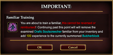 In addition to familiar training potions and tonics, you will also be able to use new familiars to level your favorite familiar. The amount of experience that the familiar is worth is based on its tier. Common treasured familiars are worth 100 experience, while uncommon legendary familiars are worth 1,000. Fabled and ethereal familiars are worth even more!