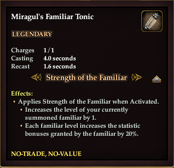 Familiar Tonics and Training Potions are available through various promotions and events, such as Yun Zi the Days of Summer merchant. When consumed, these potions immediately increase your currently summoned familiar's level by 1. Different tonics have different restrictions on what level they can raise your familiar to, so apply them with care.