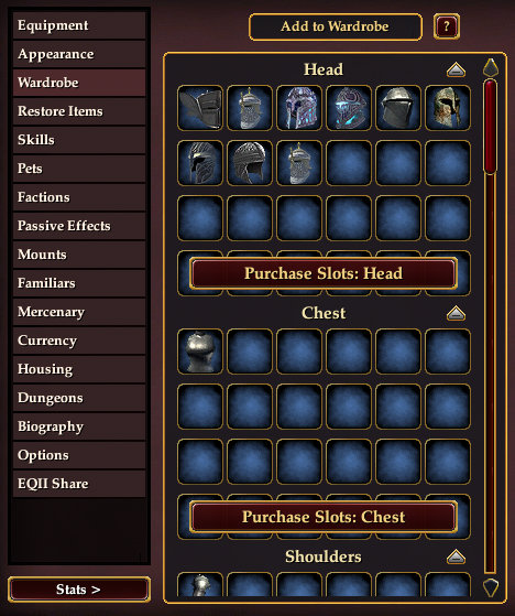 To add equipment, click on the Wardrobe tab in your character window and drag the item from your inventory onto the "Add to Wardrobe" section at the top of the page. You may also drag the item onto any of the icon rows.